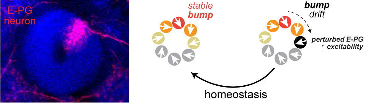 The leading hypothesis for how information is held “in mind” during short-term memory is stably maintained neural activity. Within the ring-shaped compass network, the location of a “bump” of persistent neural activity stores a representation of the fly’s current heading direction. This means that in order to properly store information about which direction the fly is facing, the network must be balanced such that each location around the ring is equally favorable–this balance would be disrupted if the properties of individual neuronal elements ever changed. We are exploring how homeostatic regulation of single-cell synaptic and intrinsic properties shapes the compass network over the fly’s lifetime.